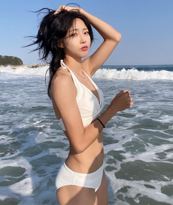 수영복 입고 자신감 있는 노출 권은비 글래머 몸매
