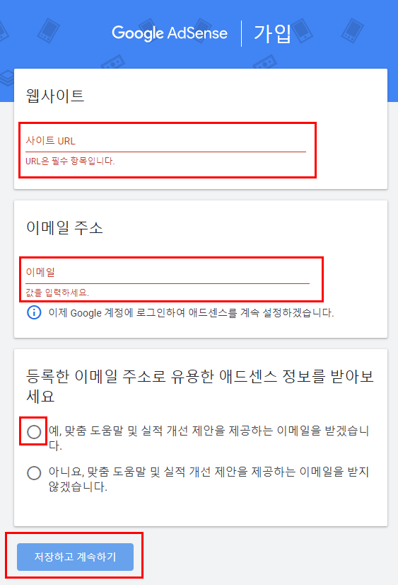 2. 승인 신청할 블로그와 이메일 주소 입력